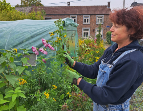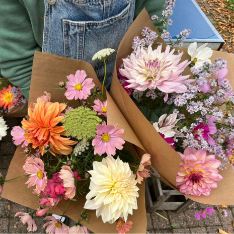 Fleuriste et productrice, j’utilise principalement les fleurs que je cultive à Dave, complétées si nécessaire par des producteurs du réseau « slow ». Je propose bouquets frais ou séchés, fleurs en vrac, décorations de mariage et ateliers autour de la fleur locale et de saison. Installée dans un endroit sans visibilité commerciale, je me déplace avec un petit "Flower Truck", tandis que les commandes peuvent toujours être retirées à l’atelier. Cette activité me permet de concilier travail de la terre et création florale. J’ai à cœur de valoriser les végétaux toute l’année, en proposant fleurs fraîches en saison et créations à partir de fleurs séchées, graminées, branches ou fruits secs, transformés selon mon inspiration.